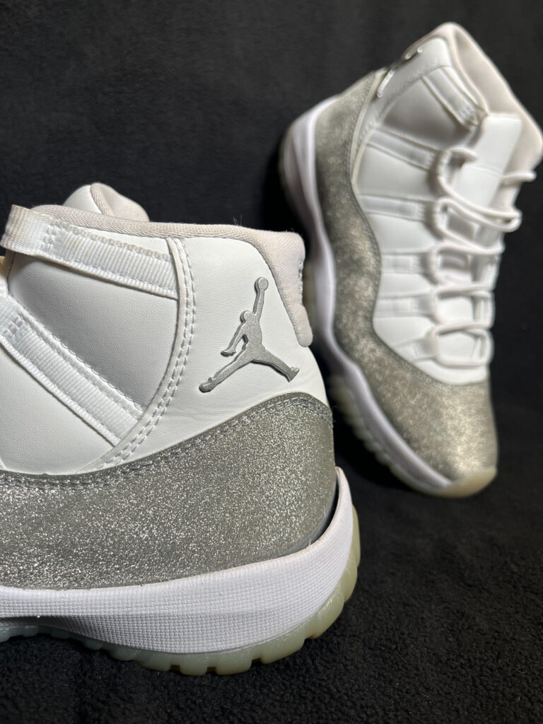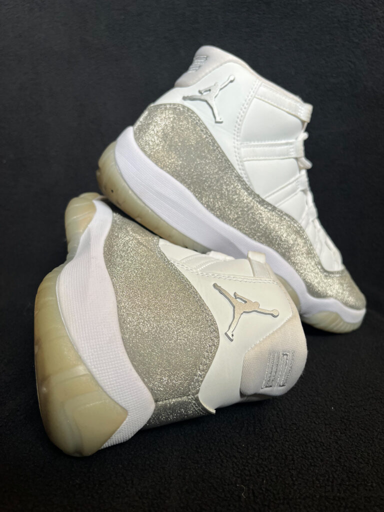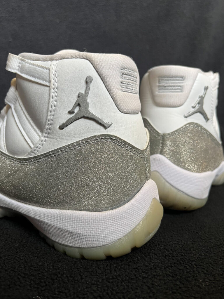 These are the Air Jordan 11 Air White Metallic. This amazing sneaker was released on November 10th, 2019. This sneaker is made with special features from top to bottom. Starting at the toe of the sneaker, you’ll see the dazzling leather covering the majority of the middle section of the sneaker. The dazzled material is complemented with a solid white leather holding the laces and a solid grey jumpman. As you move toward the heel of the sneaker, the signature 23 is stitched on the back in grey text. Lastly, but surely not least, is the icy bottom. The outsole of the white Metallics is made with an icy bottom, with white herringbone grip panels. Underneath would be the white Jumpman on a carbon fiber base plate. This white and silver metallic combination is an outstanding colorway.