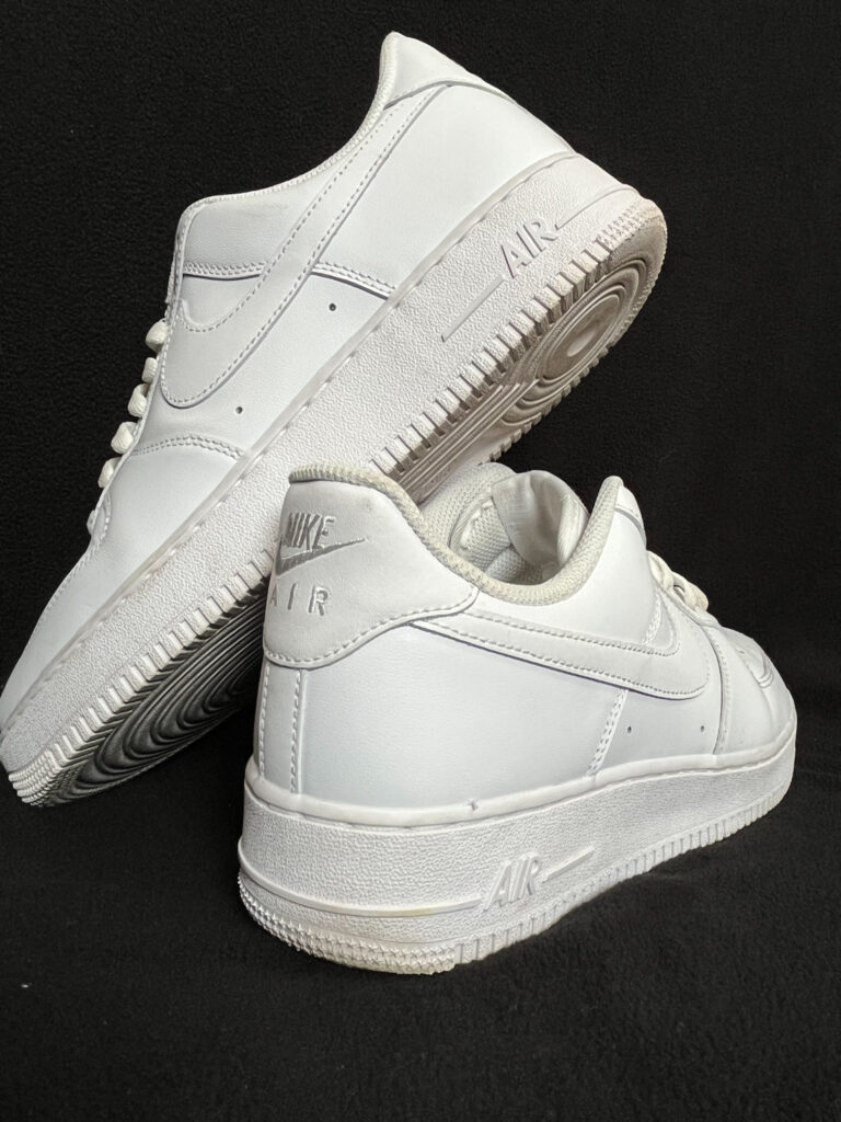 Today, we have a classic, a necessity in all sneaker collections. Today, we are looking at the Air Force 1 Low Triple White colorway. This sneaker has been released and re-released multiple times over the years. The design of the sneaker starts at the toe box. The toe box is lined with a row of diagonal pierced holes in the shoe. Right above the toe box is the AF1 metal emblem on the shoe laces. On the Mid-section of the sneaker is the all white Nike Swoosh. On the back of the sneaker, we’ll see the Nike Air text stitched on the heel panel. All around, a clean white sneaker.