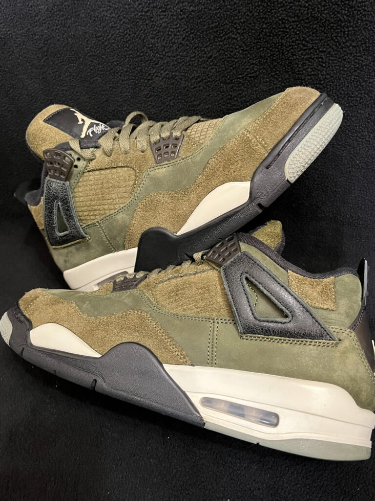 These are the Air Jordan 4 SE Craft Medium Olive. This sneaker was released on November 18th, 2023. At first glance, you’ll see that this sneaker comes in various materials, patterns, and shades of Green. The toe box contains an attached panel of nubuck green. The same nubuck green is featured on the tongue, near the shoelaces, and on a square at the ankle of the sneaker. Underneath would be the suede green. This suede is the base material for the entire sneaker, starting from the toe, through the mid-section, and ending at the heel of the sneaker. As we look at the back of the shoe, you’ll see the all black Jumpman tap. On this tap is a light, faded away, green colored Jumpman. This is all constructed on a cream, almost vanilla colored mid-sole. The outsole of this sneaker has a combination of black, green, and cream.