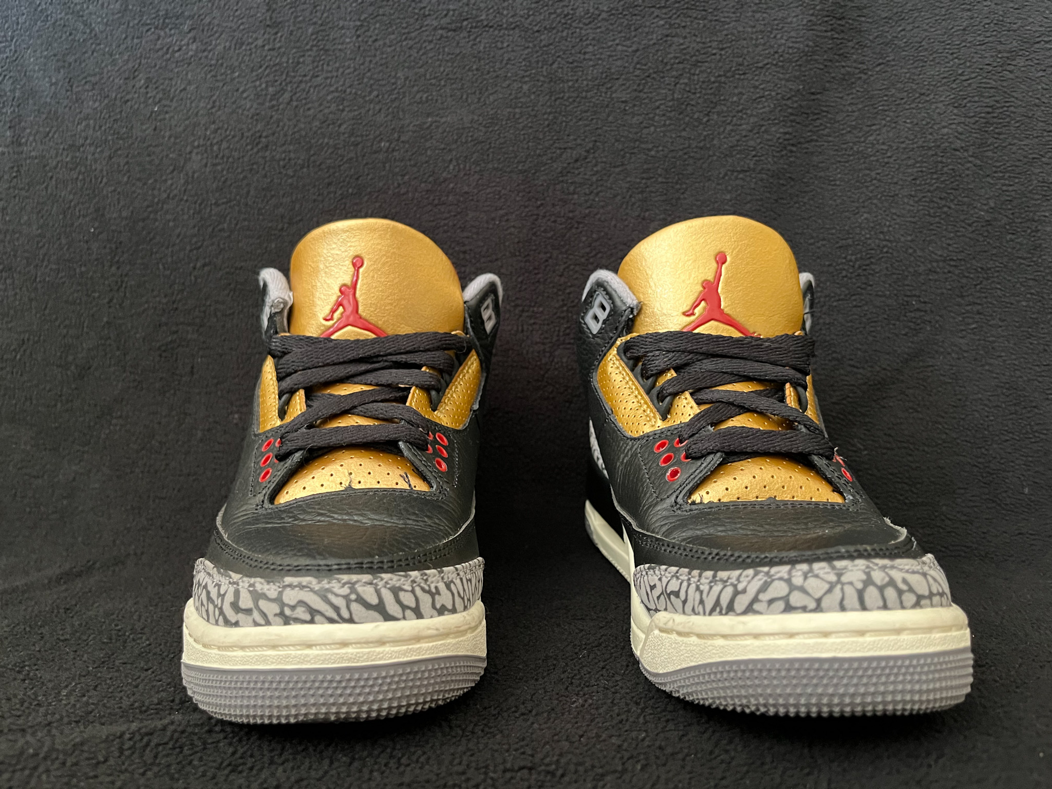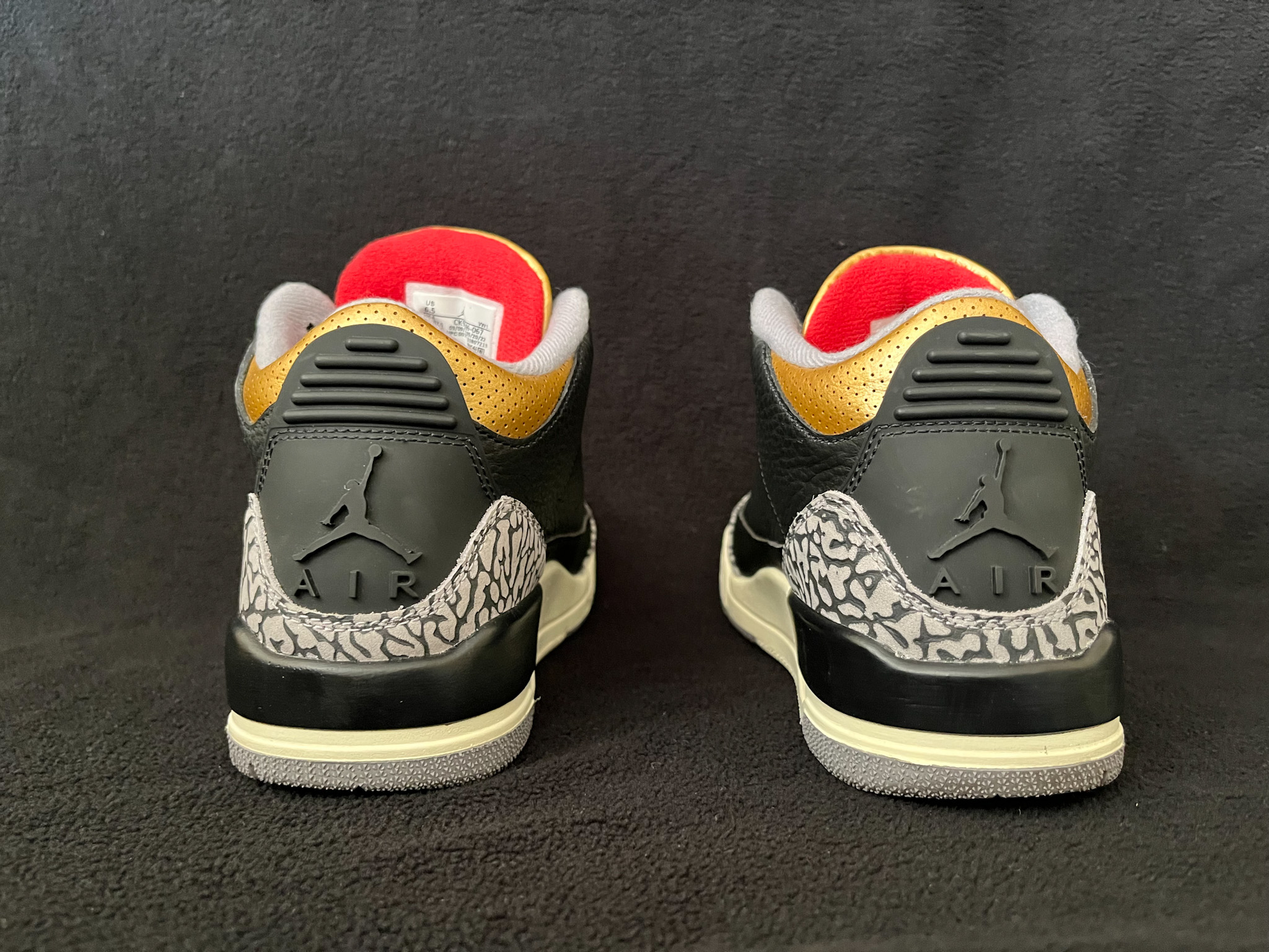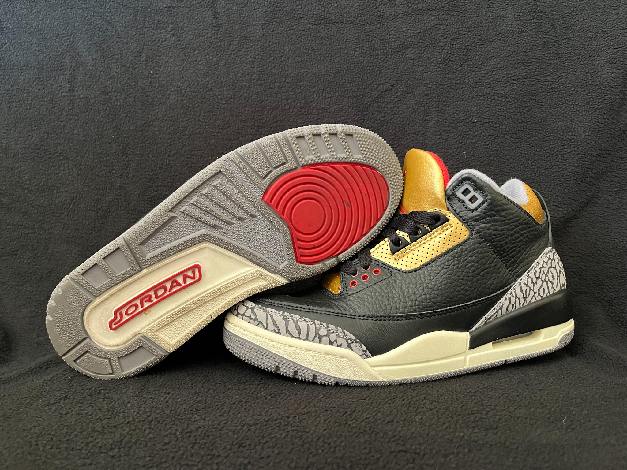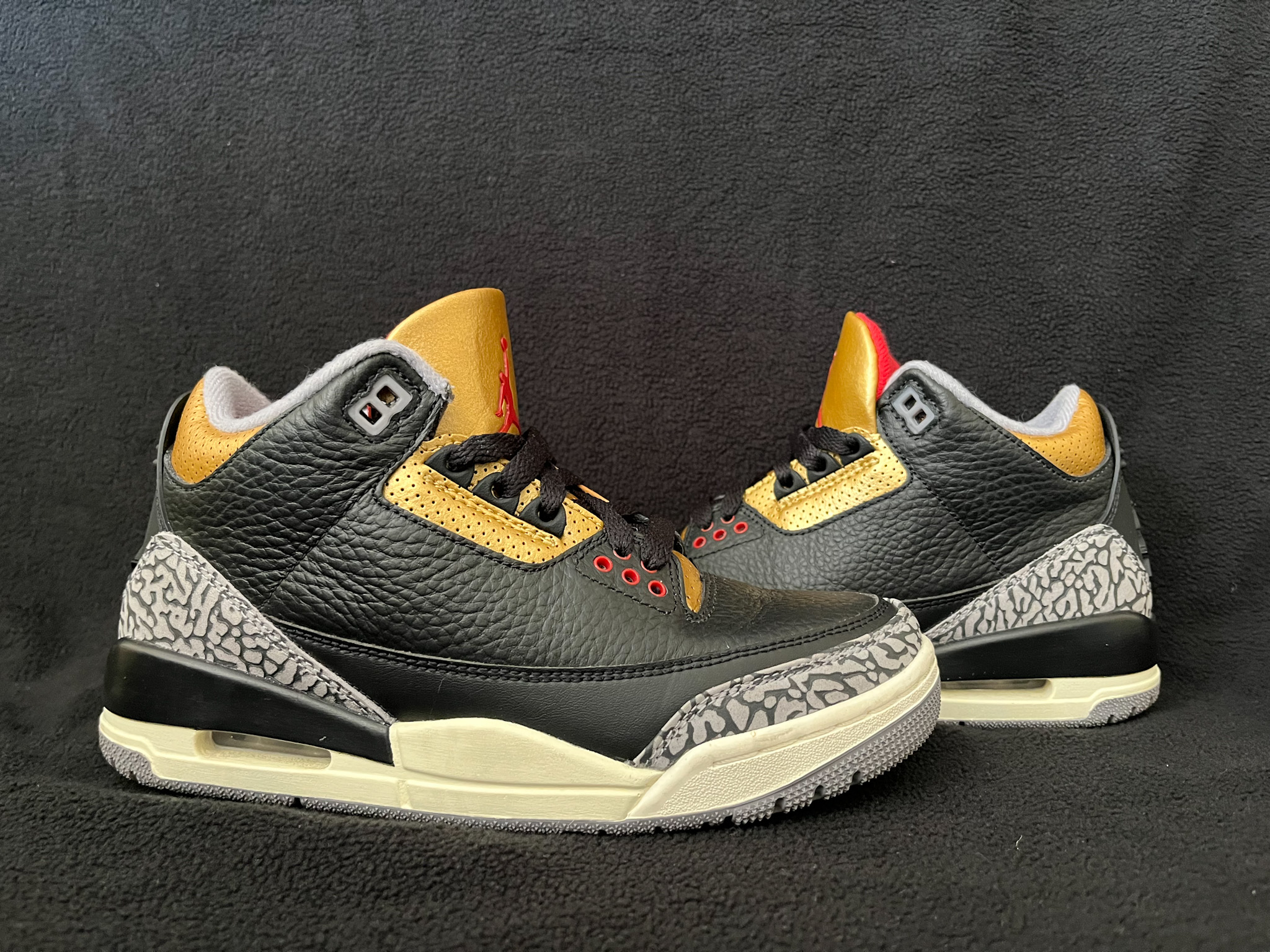 The Air Jordan 3 Black Cement Gold puts a luxurious twist on a classic. It pairs the iconic black tumbled leather upper and signature elephant print with bold metallic-gold accents for a refined, elevated look. Complete with visible Air cushioning and timeless AJ3 details, it blends heritage style with modern flair